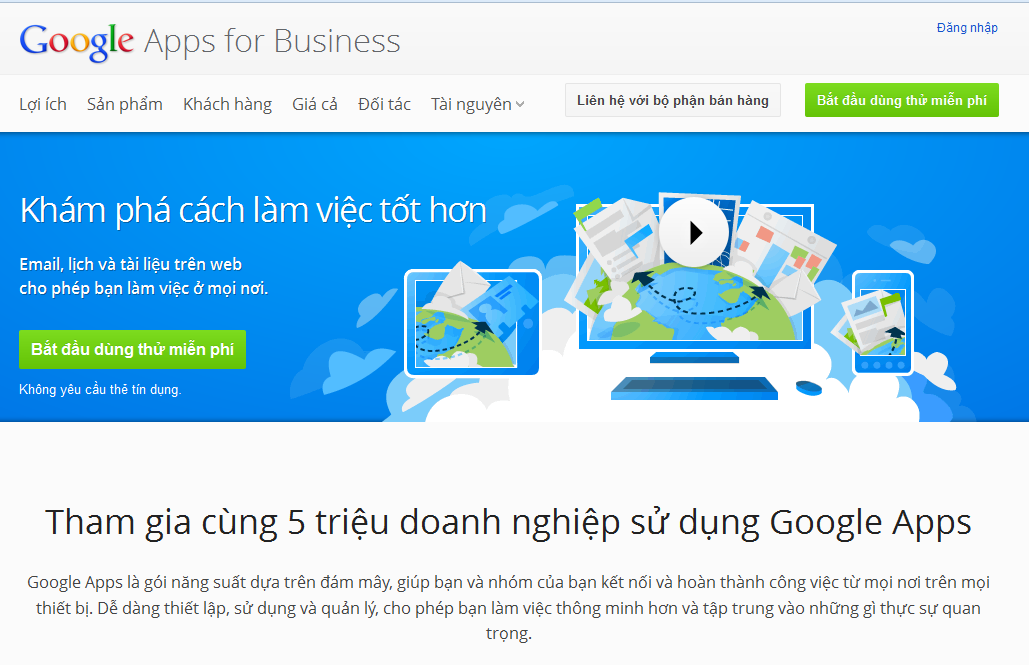 1. Truy cập vào địa chỉ http://www.google.com/intl/vi/enterprise/apps/business/. Khi trang chính của Google Apps xuất hiện. bạn bấm nút Bắt đầu dùng thử miễn phí ở góc trên bên phải.