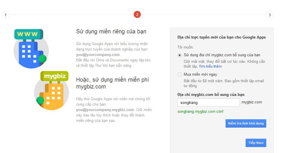 3. Trước khi thực hiện bước 2 này, bạn cần đảm bảo rằng mình đã có một tên miền riêng. Hãy điền tên miền của mình vào mục Nhập tên miền, chẳng hạn songtrang.mygbiz.com. Sau khi điền xong, bạn bấm nút Tiếp theo