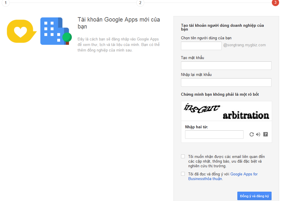 Đồng thời, ở bước này, bạn cũng cần đọc kyc điều khoản quy định khi sử dụng Google Apps. Sau khi đọc xong, bạn bấm nút Đồng ý và đăng ký