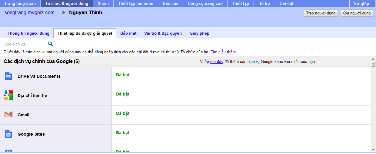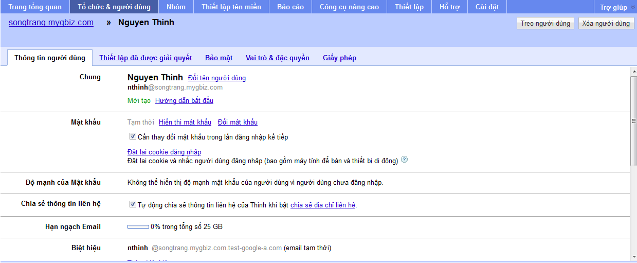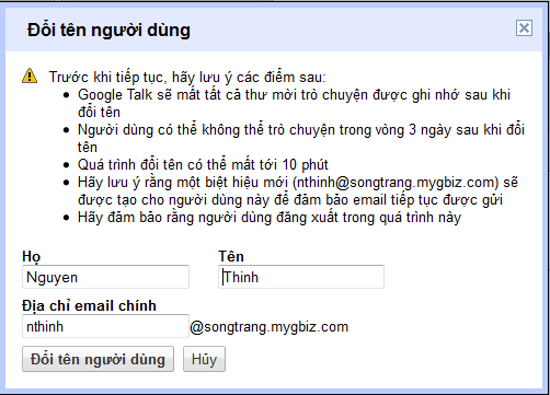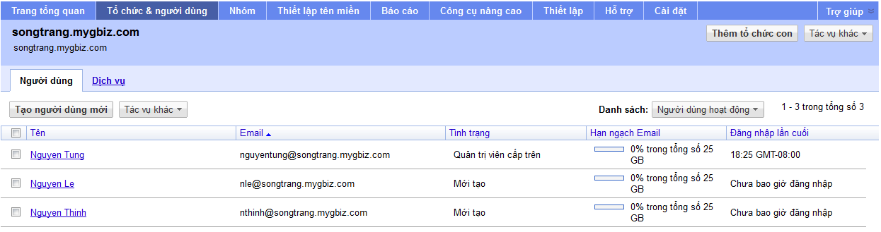 Sau khi hoàn thành việc tạo danh sách người dùng Google Apps của tổ chức mình, bạn có thể thực hiện các thao tác hiệu chỉnh như: đổi tên người dùng, địa chỉ email, thay đổi mật khẩu.