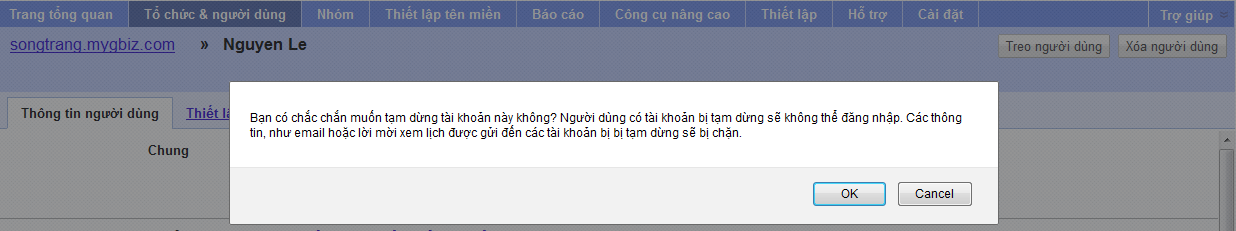 Để ngừng tạm thời một người dùng trên Google Apps, bạn kích chọn người dùng đó và bấm nút Treo người dùng. Khi hộp thoại xác nhận xuất hiện, bạn bấm nút OK để đồng ý.