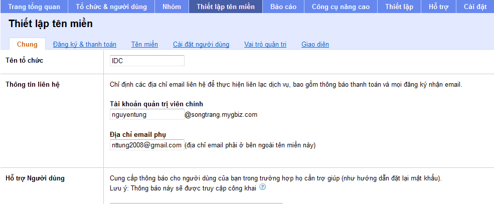 Để bắt đầu, bạn đăng nhập vào Google Apps với tài khoản quản trị tại địa chỉ www.google.com/a/your_domain.mygbiz.com . Trong màn hình chính, bạn kích liên kết Thiết lập tên miền. Trên tab Chung, bạn có thể thay đổi tên tổ chức, tài khoản quản trị viên chính, địa chỉ email phụ…