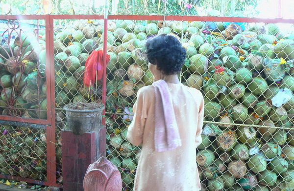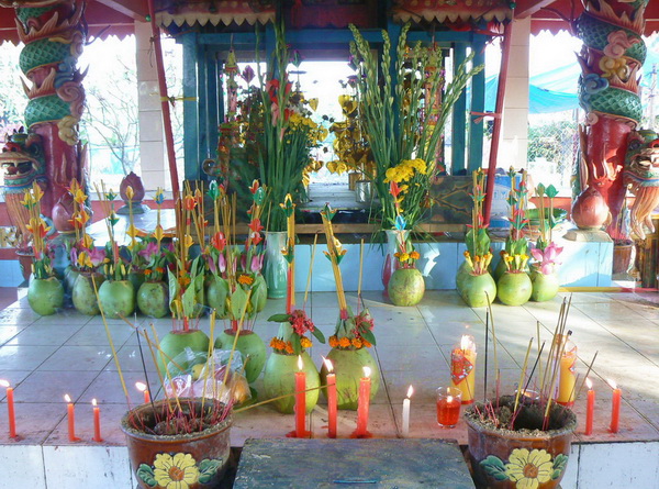 Dừa đủ cở lớn nhỏ, mỗi gia đình tùy theo lời nguyện của mình mà đem theo dừa dâng cúng. Thường mỗi người đem đến một cặp dừa nhưng cũng có gia đình đem đến 7 - 8 cặp, có màu sắc khác nhau. Nhìn kỹ sẽ thấy đa số lễ vật cúng có năm thứ tượng trưng cho năm vị bồ tát, bao nhiêu lòng thành của khách hành hương như gởi gắm trong chiếc bình nhỏ bằng trái dừa.