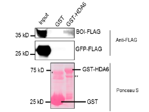 Với phương pháp tương tác protein trên in vitro, resin chứa protein tái tổ hợp GST hoặc GST-HDA6 biểu hiện trên E. coli được sử dụng làm giá thể để bắt giữ protein BOI-FLAG hoặc GFP-FLAG từ cây Arabidopsischuyển gen nếu có tương tác xảy ra. Hình ảnh Western Blot cho thấy cả BOI-FLAG và GFP-FLAG đều không được phát hiện trên resin có chứa GST. Điều này cho thấy BOI-FLAG và GFP-FLAG không tương tác in vitro với GST. Bên cạnh đó, chỉ có BOI-FLAG được phát hiện trên resin có chứa GST-HDA6 chứng tỏ BOI-FLAG mà không phải GFP-FLAG tương tác in vitroGST-HAD6 (Hình 2). Kết quả này chứng minh tương tác trực tiếp của BOI với HDA6 in vitro.