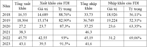 Dữ liệu từ năm 2018 đến 2023 cho thấy sự gia tăng đáng kể trong xuất khẩu cơ khí của Việt Nam. Tuy nhiên, năm 2023 xuất khẩu cơ khí giảm nhẹ 5,7%, có thể do ảnh hưởng từ suy thoái kinh tế toàn cầu và căng thẳng thương mại. Mặt khác, nhập khẩu cơ khí từ FDI cũng có xu hướng giảm, từ 63,35% năm 2020 xuống 69,06% năm 2022, phản ánh sự gia tăng năng lực sản xuất nội địa và sự điều chỉnh chính sách kinh tế. Điều này cho thấy sự phát triển mạnh mẽ của ngành cơ khí nội địa, đồng thời cũng là thách thức đối với các doanh nghiệp phải điều chỉnh chiến lược sản xuất và phân phối để thích nghi với những biến động mới trong chuỗi cung ứng toàn cầu.