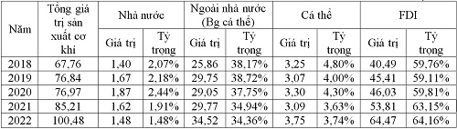 Tổng sản lượng sản xuất cơ khí Việt Nam các năm và đóng góp của các thành phần
