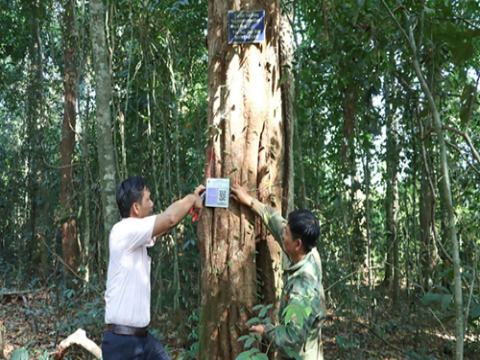 Lực lượng chức năng gắn mã QR cung cấp thông tin chi tiết về thông tin loại cây rừng tại VQG Bù Gia Mập. (Ảnh:BP).