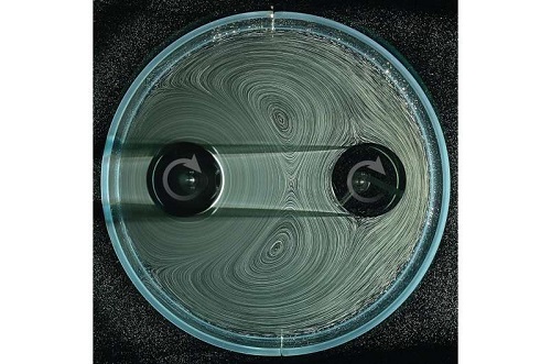 Hai bộ phận quay nằm bên trong một khoang tròn và được bao quanh bởi chất lỏng có các bọt khí giúp trực quan hóa dòng chảy. Bộ phận quay bên trái được chủ động dẫn động bằng một động cơ (không hiển thị), trong khi bộ phận bên phải quay thụ động nhờ các dòng chảy tạo ra. Nguồn: Phòng Thí nghiệm Toán học Ứng dụng, Đại học New York (NYU).