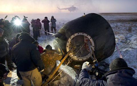| Ba nhà phi hành gia là Mike Fossum (Mỹ), Sergei Volkov (Nhật) và Satoshi Furukawa (Nhật) từ Trạm không gian quốc tế trong tàu vũ trụ Soyuz của Nga hạ cánh an toàn xuống một vùng hẻo lánh ở Kazakhstan vào ngày thứ ba tuần trước. Ảnh: NASA. |