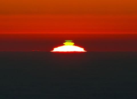 | Hai hình cung màu xanh riêng biệt trên mặt trời đang lặn ở ngọn núi Cerro Paranal. Hiện tượng này xảy ra khi ánh nắng mặt trời bị 'bẻ cong' tách thành nhiều màu sắc khác nhau do từ trường của trái đất. Ngọn núi Cerro Paranal cao 2.600m ở sa mạc Atacama của Nam Mỹ, được biết đến là nơi khô cằn nhất trên trái đất. Ảnh: ESO. |