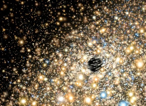 Khi sử dụng kính thiên văn Gemini North ở quần đảo Hawaii, Mỹ để quan sát di chuyển của các ngôi sao trong các thiên hà gần trái đất, các nhà khoa học phát hiện siêu hố đen có kích thước gấp 10 tỷ lần mặt trời. Các lỗ đen là những vật thể có trường hấp dẫn lớn tới mức không có một thứ gì, kể cả ánh sáng, có thể thoát khỏi sức hút của nó. Ảnh: Gemini.