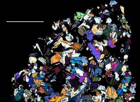 Qua kính hiển vi, các khoáng chất của thiên thạch trông giống như những mảnh giấy vụn nhiều màu sắc. Vật chất quan sát được lấy từ thiên thạch HED (HED Meteorite) – thiên thạch có nguồn gốc từ lớp vỏ của tiểu hành tinh Vesta. Ảnh: NASA.