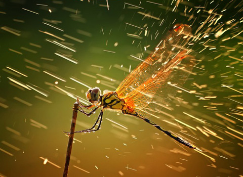 | Bức tranh giành giải nhất có tên "Splashing" của tác giả Shikhei Goh. Tác giả bức tranh cho biết, trong một trận mưa bất ngờ trên đảo Riau của Indonesia, anh đã ghi lại được cảnh chuồn chuồn đạp cánh rũ nước khi nắng lên. Một thành viên ban giám khảo nói rằng tác giả đã chụp ở góc máy gần với ánh sáng rất hoàn hảo. |