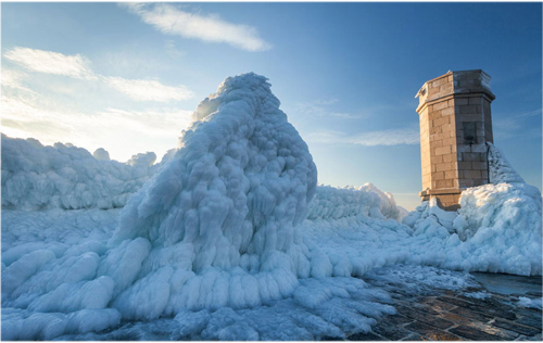 Đường bờ biển dài phủ đầy các lớp sóng bị đóng băng có màu trắng xóa. Nhiệt độ lạnh và thời tiết xấu cũng khiến các hoạt động đi lại gặp nhiều khó khăn.