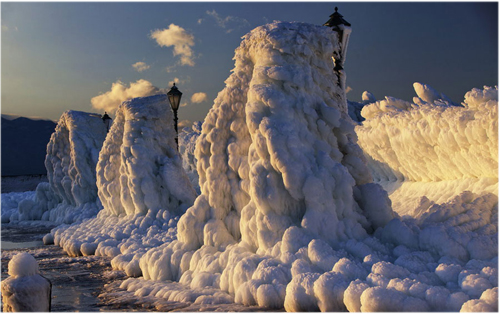 Sóng đóng băng có chiều cao từ 3-5 m với nhiều hình thù kỳ lạ được hình thành từ những đợt sóng cao đánh vào bờ. Trong ảnh là cột sóng trông giống những cây kem trắng khổng lồ.