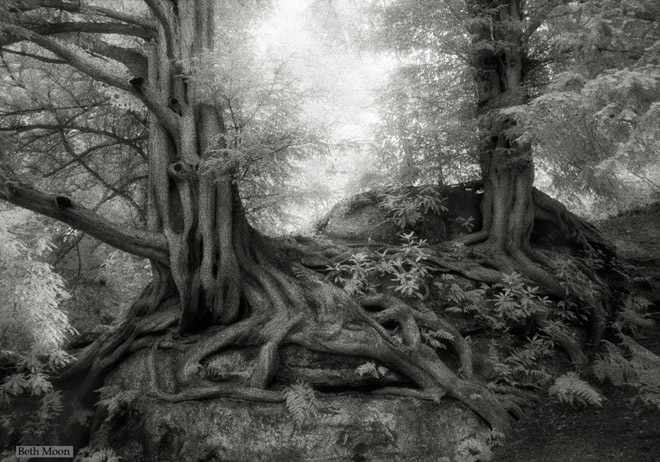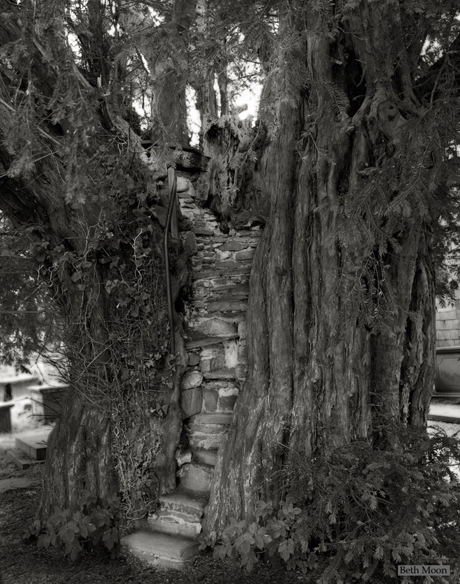 Một cây thủy tùng cổ khác mọc trong sân một nhà thờ nhỏ ở xứ Wales, có từ năm 1850. Bục giảng đạo với các bậc thang và ghế ngồi được xây ở giữa thân cây.