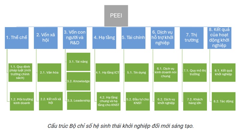 Trên cơ sở đó, khung phân tích được đề xuất gồm 8 trụ cột chính, phản ánh toàn diện từ điều kiện đầu vào đến kết quả đầu ra của hệ sinh thái khởi nghiệp.