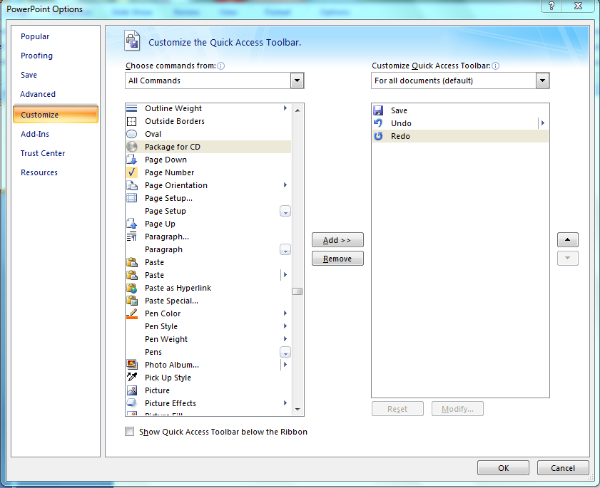 Trong PowerPoint 2007 có một tùy chọn Package for CD nó cho phép bạn đóng gói bài thuyết trình của mình với định dạng là .ppt. Do đó chức năng Package for CD này là 1 giải pháp. Để mở gói Package for CD bạn vào File -> PowerPoint Option -> Customize. Sau đó bạn tìm Package for CD và Add vào