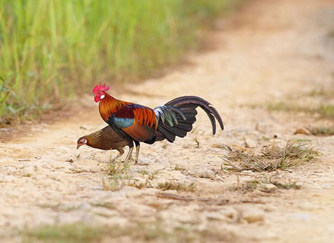 | Gà rừng Gallus gallus. Chim lớn, cánh dài 200-250mm, nặng 1-1,5kg. Chim đực có lông đầu, cổ màu đỏ da cam, lưng và cánh đỏ thẫm, ngực bụng và đuôi đen. Chim mái nhỏ hơn chim đực và toàn thân màu nâu xỉn. Mắt nâu hay vàng cam. Mỏ nâu sừng hoặc xám chì. Mỏ thịt đỏ. Chân xám nhạt. Gà rừng định cư và ở trong nhiều kiểu rừng. Sinh cảnh thích hợp là rừng thứ sinh gần nương rẫy hay rừng gỗ pha giang, nứa. Sống đàn hoạt động vào 2 thời điểm trong ngày là sáng sớm và xế chiều. Buổi tối chúng tìm đến những cây cao dưới 5m có tán lớn để ngủ. Chúng thích ngủ trong các bụi giang, nứa, có nhiều cây đổ ngang. (Ảnh: Tăng a Pẩu) |