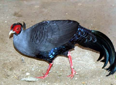 | Gà lôi hông tía Lophura diardi. Chim đực trưởng thành mào dài 70 - 90mm, thường dựng đứng, có màu đen lam ánh thép. Đầu, cằm, họng màu đen. Phần dưới lưng màu vàng kim loại. Hông và trên đuôi màu lam ánh thép và đỏ tía. Phần còn lại của bộ lông nhìn chung có màu lam. Chim cái trưởng thành không có mào nhưng lông ở đỉnh đầu dài hơn.Thường gặp trong các loại rừng khác nhau và chỗ cây bụi, kể cả nơi trống trải, dọc đường đi. Độ cao vùng phân bố khoảng dưới 750m. Đi lẻ hoặc đàn nhỏ và chỉ phân bố từ các tỉnh từ Hà Tĩnh trở vào miền Nam. Đây là loài được đưa vào Sách đỏ Việt Nam. (Ảnh: Phùng Mỹ Trung) |