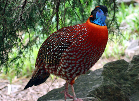 | Gà lôi tía Tragopan temminckii. Chim đực trưởng thành nhìn chung bộ lông có nhiều màu sắc đẹp như đỏ lửa, đỏ nâu và nâu lẫn đen. Hầu hết ở giữa các lông đều có các vệt xám xanh da trời rộng. Mắt nâu, mỏ đen, da quanh mắt xanh da trời. Chân hồng. Chim đực non 1 năm tuổi giống chim cái nhưng kích thước hơi lớn hơn. Chim cái có vệt đen hung và trắng, nhìn thô hơn so với chim đực. Thường chỉ gặp loài này ở Lào Cai, trên độ cao 2000 - 3000m. Chúng là loài đặc hữu Việt Nam và được ghi vào Sách đỏ Việt Nam. (Ảnh: Dick Daniels) |