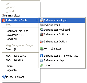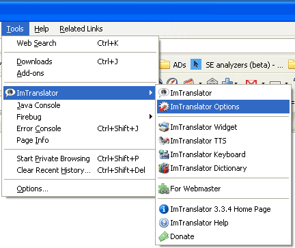 ImTranslator chọn từ các công cụ Firefox, trình đơn ImTranslator