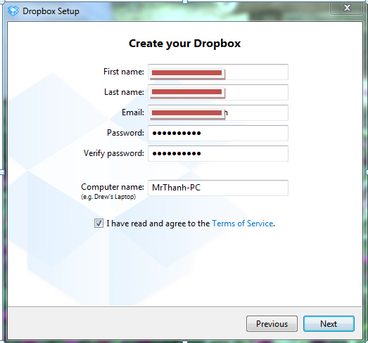 Nhập thông tin để tạo tài khoản trên Dropbox.