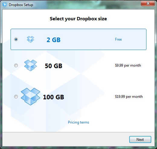 Chọn dung lượng cho Dropbox, ở đây tôi chọn 2GB miễn phí.