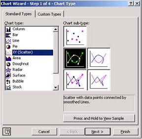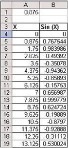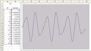 Giá trị của biến X sau luôn bằng giá trị của biến X trước nó cộng với trị quy định ở ô A1. Bạn cho giá trị ban đầu của biến X là 0 (ô A4), công thức cho ô A5 = A4 + $A$1. Tiếp đó bạn chọn một khoảng (trong trường hợp này là A5:A19) rồi nhấn Ctrl + D để copy công thức từ ô A5 xuống các ô còn lại. Cột B chứa giá trị hàm số Y=SIN(X). Sau đó bạn vào Insert\ Chart để vẽ biểu đồ cho vùng giá trị mà bạn đã tạo. (Bạn nên dùng Chart Type là XY Scatter).