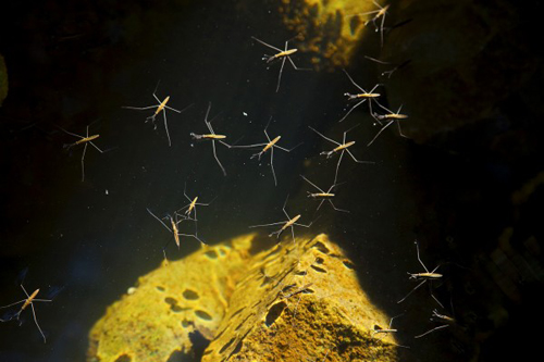 | Theo các nhà nghiên cứu, hiện có khoảng 340 loài rệp nước sống trong môi trường tự nhiên. Đây là loài côn trùng sống gần như hoàn toàn trên bề mặt nước. Khi đặt chân xuống nước, chúng tạo ra các vết lõm trên bề mặt, sức căng của mặt nước đẩy chúng về phía trước. Sải chân giúp chúng trượt trên mặt nước bằng chuyển động lướt nhanh cặp chân về phía sau, tạo xoáy nước bên dưới bề mặt nước và đẩy chúng về phía trước, giống chuyển động của thuyền có mái chèo. Lớp lông giống sáp ở chân là đặc điểm giúp chúng không thấm nước. |  3. Nhện