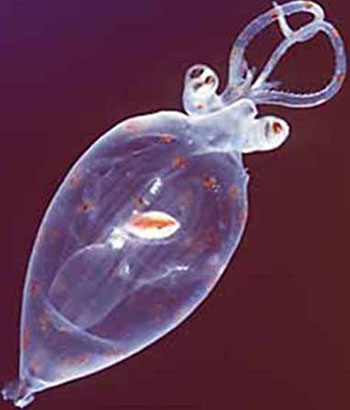Mực ống. Có khoảng 60 loài mực ống thủy tinh trên thế giới. Cơ thể trong suốt giúp con mực ẩn nấp trước kẻ săn mồi. Nhiều loài còn có khả năng phát quang sinh học. Ảnh: WikiCommons