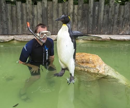 Charlotte là một con chim cánh cụt vua nhưng lại sợ nước. Nó đập nước bắn tung tóe khi được đưa xuống bể học bơi với nhân viên khu bảo tồn. Ảnh: BNPS