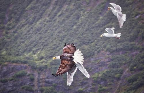 Trong bức ảnh Canales may mắn chụp lại, đại bàng đầu trắng vừa bay vừa quắp chặt mòng biển bằng những móng vuốt sắc nhọn. Tuy nhiên, cuộc đi săn của đại bàng không hề thuận lợi khi bên trên, một con mòng biển khác đang sà xuống và mổ vào lưng nó trong nỗ lực cứu đồng loại.
