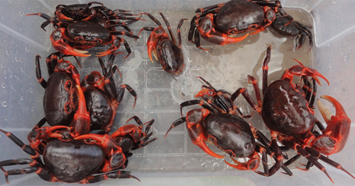 Cua có kích thước trung bình, mai có màu đỏ tới nâu đỏ, càng và chân đỏ tươi. Ảnh do nhóm nghiên cứu cung cấp.