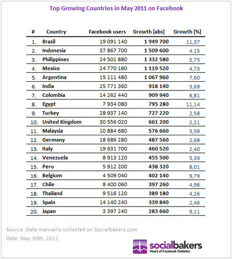 Brazil là quốc gia góp phần thúc đẩy mạnh mẽ nhất sự tăng trưởng người dùng trên Facebook. Chỉ trong tháng 5 vừa qua, đất nước này đã có thêm 1,9 triệu người dùng mới, chiếm 11,37% tổng giá trị tăng trưởng.