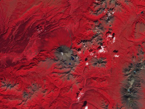 Những làn khói trắng bốc lên từ núi lửa Kizimen trên bán đảo Kamchatka của Nga. Những khu vực có cây cối được tô màu đỏ để người xem có thể nhìn rõ vị trí của những cột khói.