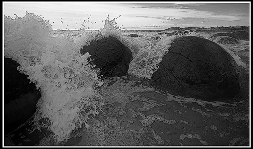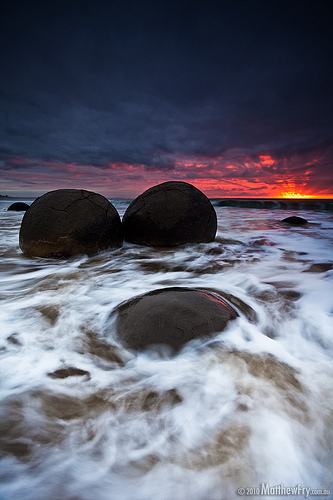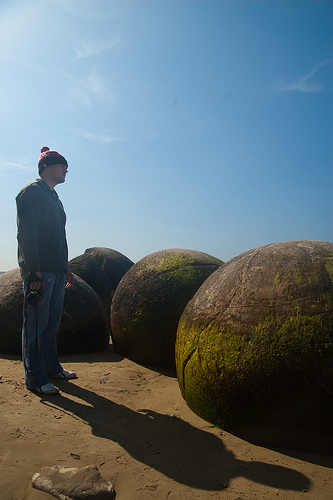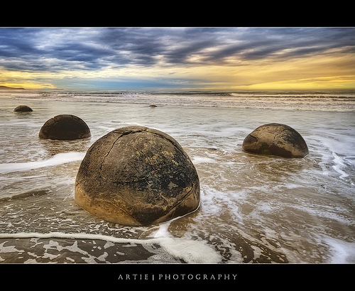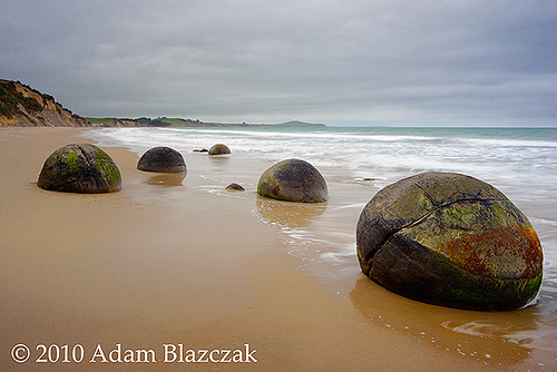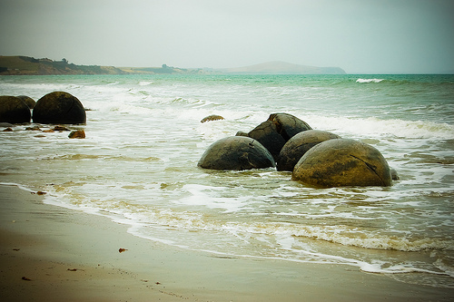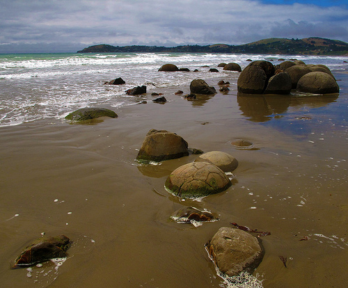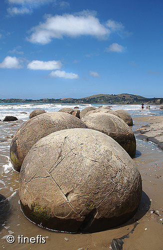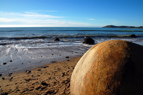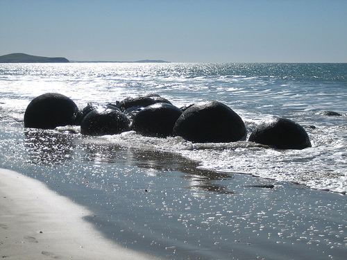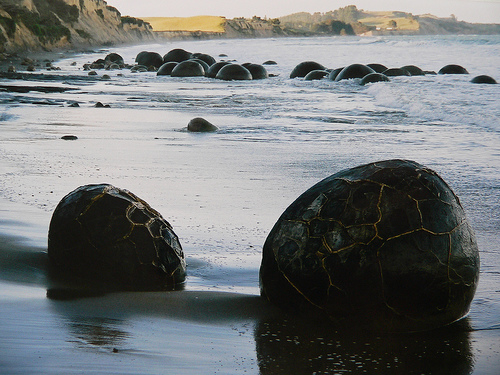 Cách TP Omaru (New Zealand) khoảng 40km về phía nam là làng chài Moeraki, nơi có những khối đá hình cầu như những viên bi khổng lồ nằm rải rác dọc bãi biển Koekohe.