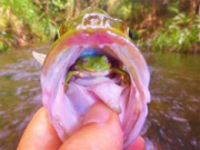 Kinh ngạc khi phát hiện một con ếch cây còn sống, đang trú ngụ bên trong miệng của một con cá ngựa nam (jungle perch) to lớn.